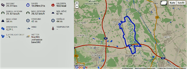 Gestern Abend hatten wir noch einen Stammtischtermin, der jedes Jahr traditionell in Rheine stattfindet und mit Hallenfußball und anschließendem Essen zu tun hat. Die Hinfahrt stellte sich als anstrengend heraus, da uns der Wind direkt von vorne anblies. Die Statistik (Endomondo) dieser Hinfahrt ist jedoch verfälscht, da die Uhr am Ziel noch mindestens 30 Minuten weiterlief. Die Rückfahrt verlief dann angenehm, da uns der Wind anschob.