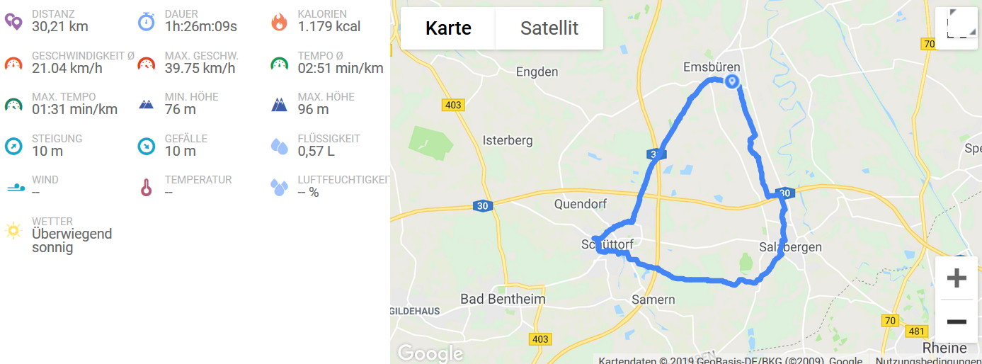 Heute war ich alleine unterwegs, da Michi sich nach längerer Erkrankung noch zu schlapp fühlt. Ich habe mich für eine kürzere Runde entschieden und bin über Bernte und Elbergen nach Gleesen gefahren. Von dort aus ging es wieder nach Hause. Es war heute frisch und es roch nach Regen, von dem ich allerdings verschont blieb.